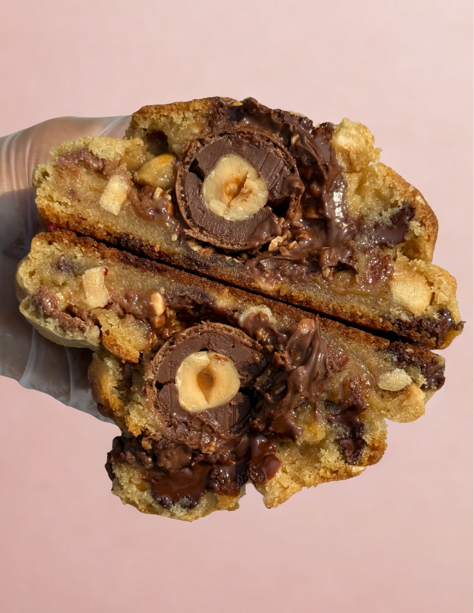 Vanilla cookie with milk chocolate chips and dark chocolate, filled with a full ferrero rocher and ferrero cream.