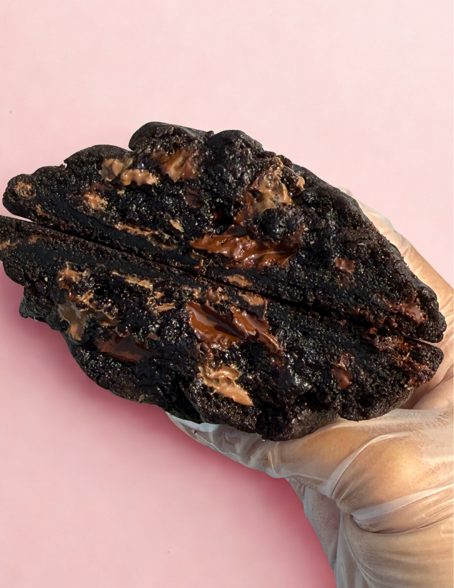 Dark chocolate cookie with dark chocolate chips and milk chocolate chips.