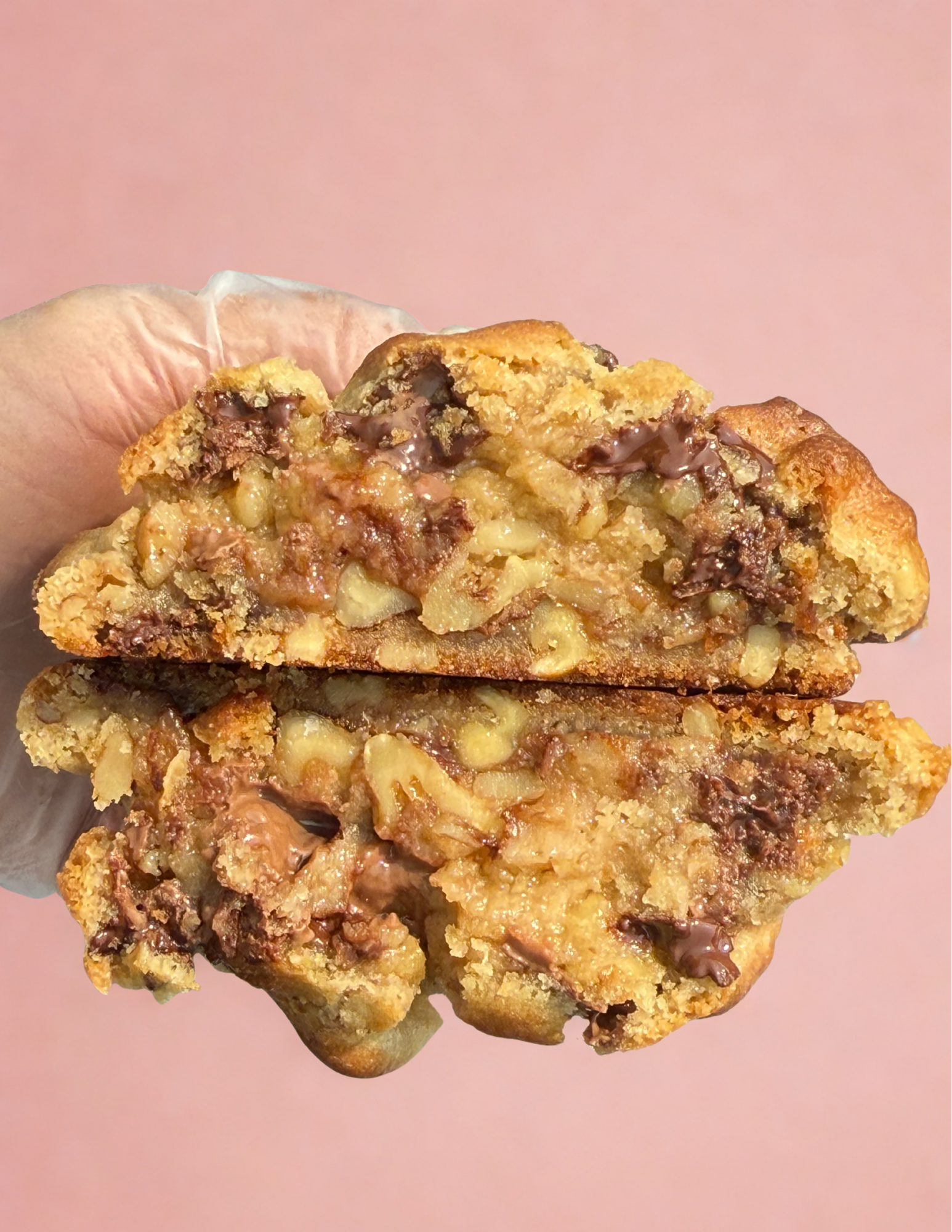 Vanilla cookie with milk chocolate chips, dark chocolate chips and toasted walnut pieces.